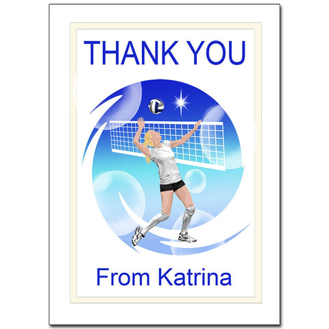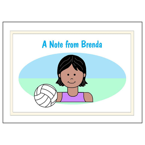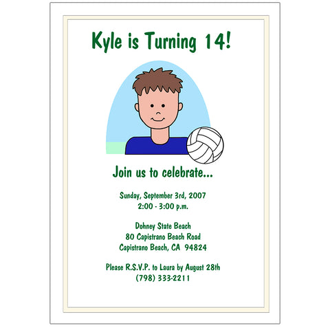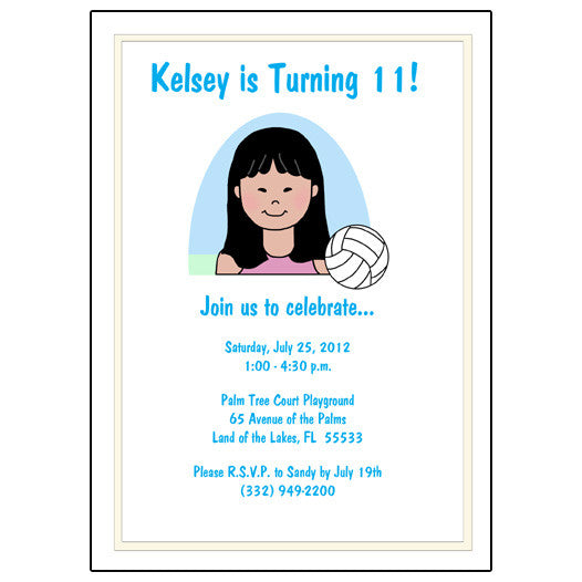 Let your guests know you're planning to serve up a good time at your Volleyball theme party! Select any one of our cartoon girls to resemble your child for this special Volleyball invitation. Perfect for a birthday party or a team celebration. Your invitaitons will be custom printed in full color with your own headline, wording, and choice of font color. Cards measure 5" x 7". Price is per card. Plain white envelopes are included.