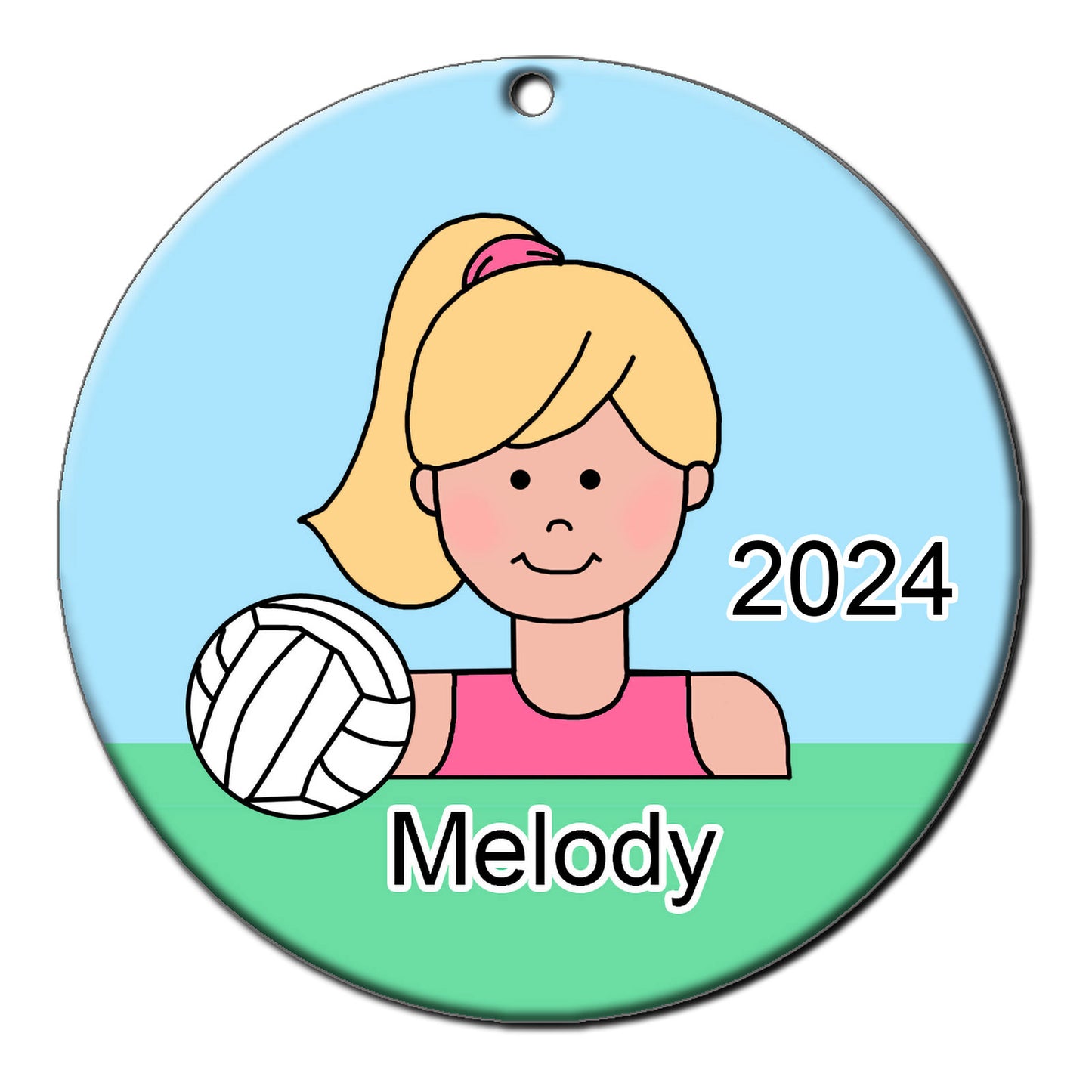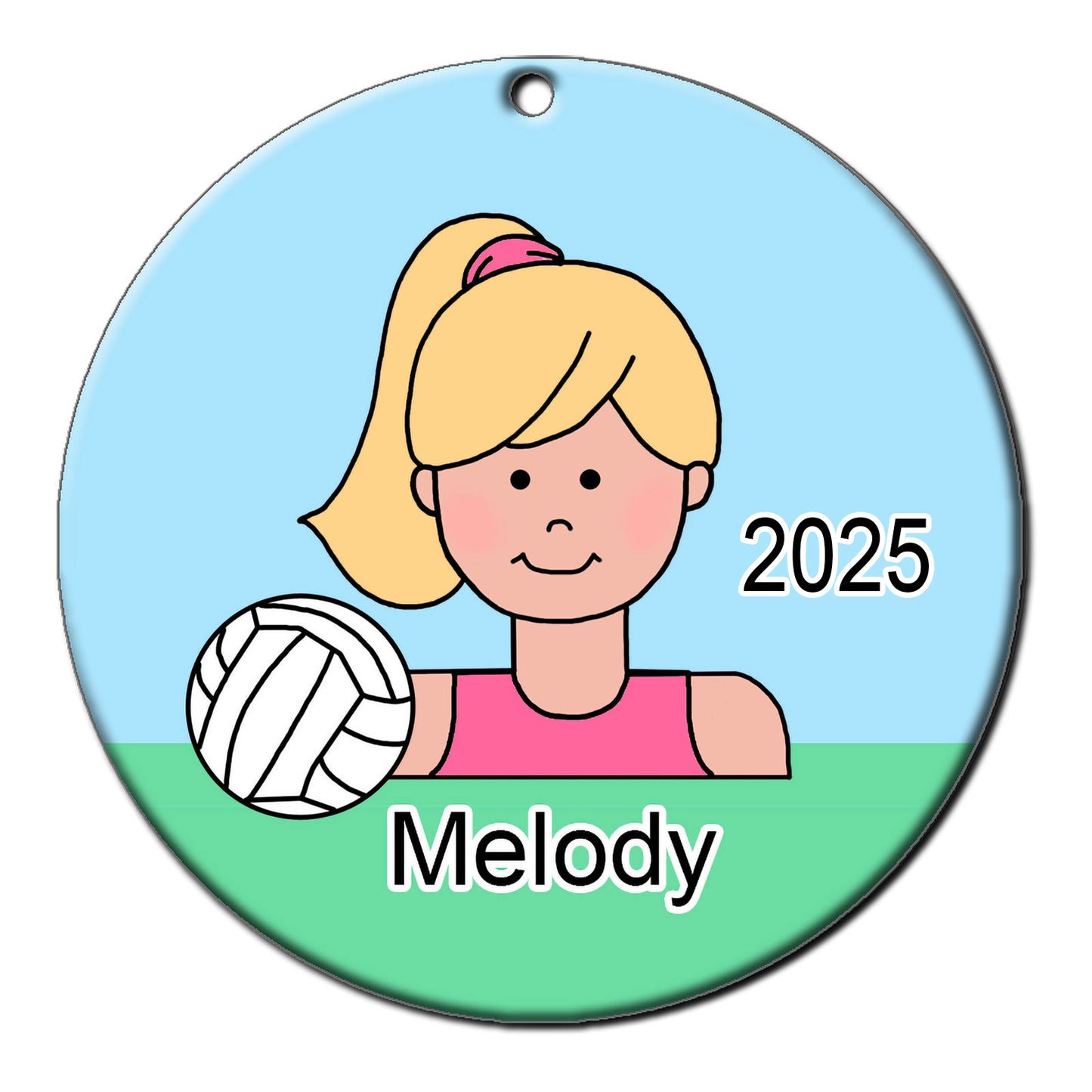 Kids who love volleyball will love this personalized volleyball Christmas ornament. Choose any of our cartoon girls with different skin and hair colors and personalize it with your child's name and year. 2.75" flat ceramic ornament comes with gold cord for hanging.Share