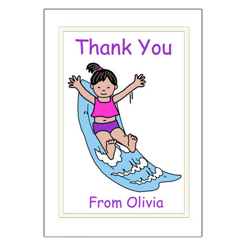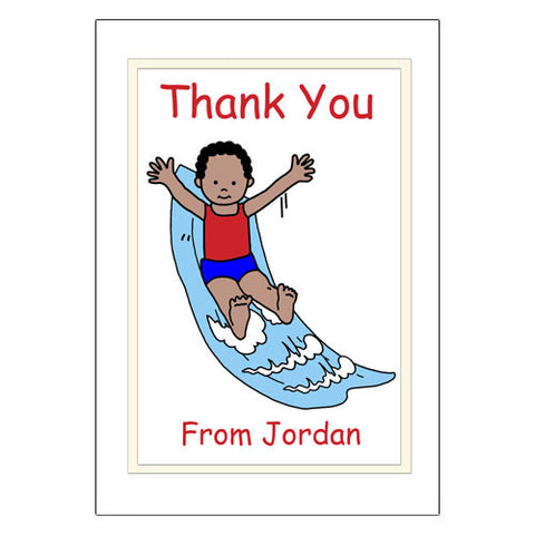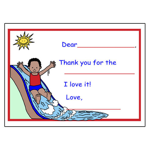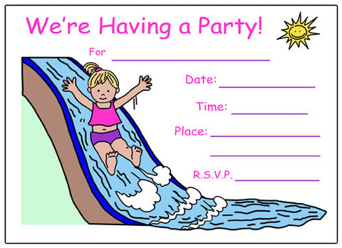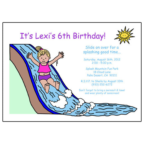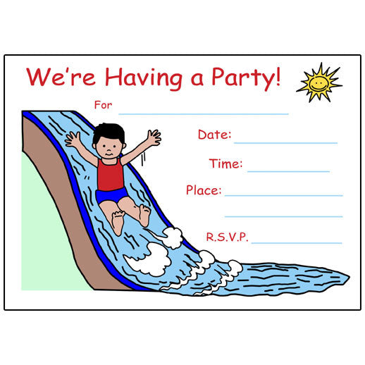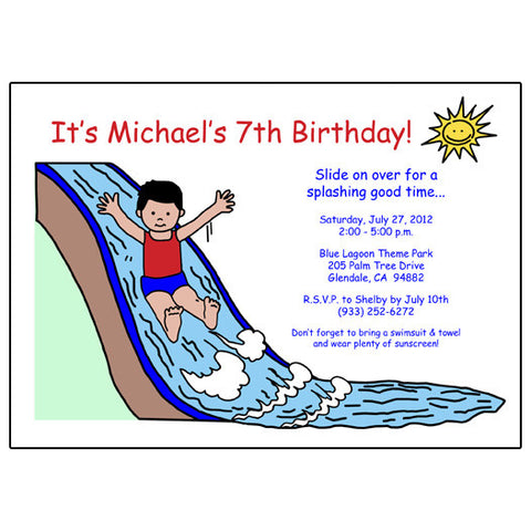 Invite your guests for a splashing good time with these water slide birthday party invitations. Select from 9 boys with different skin and hair colors. Perfect for your next pool party, water slide party, or party at home with a slip n slide and water fun. Cards measure 5" x 7". Price shown is for a pack of 10 fill in the blank style invitations with plain white envelopes.Share